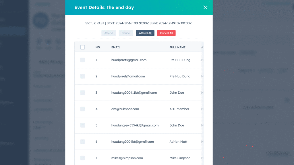 This feature allows administrators to efficiently change the attendance status of multiple contacts in an event. Admins can choose to ‘Attend All’ or ‘Cancel All’ for all participants or update only the selected contacts. This streamlines attendance management and ensures accurate event tracking
