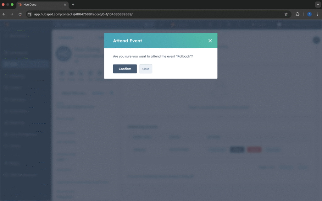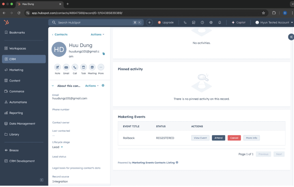 The Marketing Events card will now display all events the contact is attending and allow you to take actions.